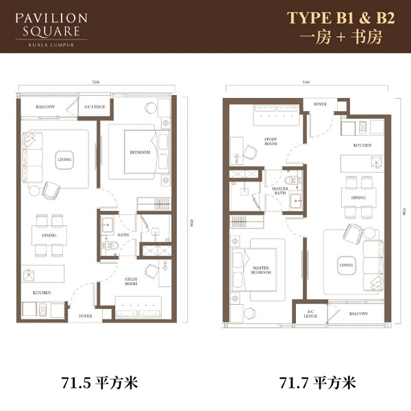 一房+书房 : 1,864,000马币起(71.5-71.7平方米)