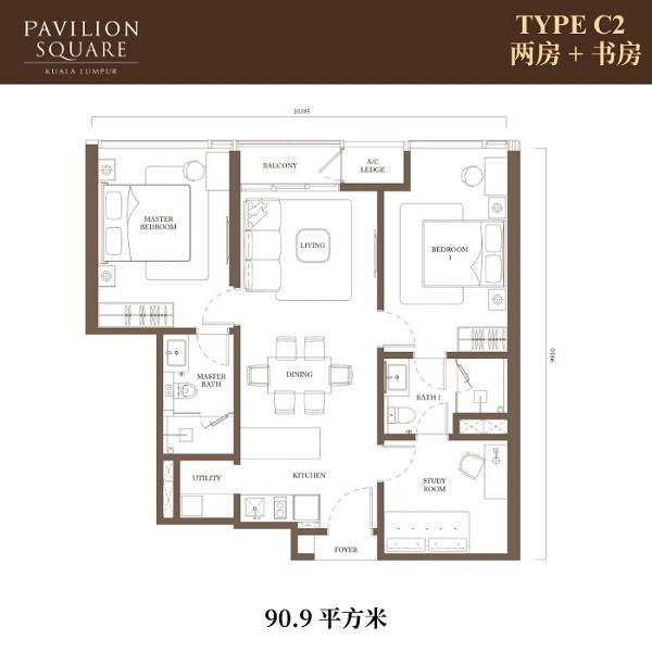 两房+书房 : 2,332,000马币起(91-118平方米)